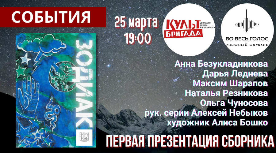 25 марта в 19.00 в книжном магазине «Во весь голос» в Москве в авторском проекте Вячеслава Коновалова «КультБригада» пройдет первая презентация книги «Зодиак» редакторской серии А. Небыкова «Время прозы».